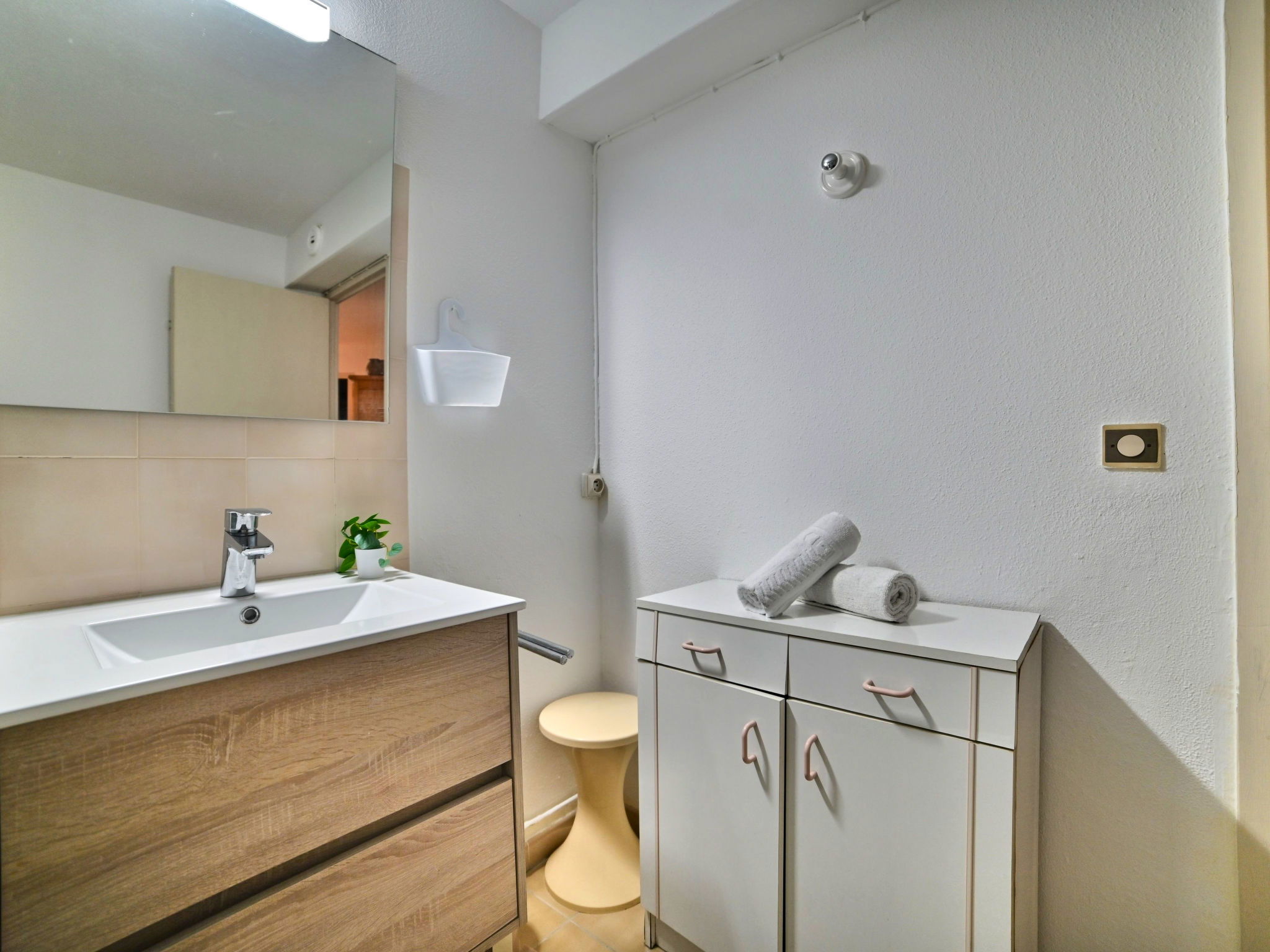3-room apartment 40 m2, on the ground floor. Simple furnishings: living/dining room 20 m2. Exit to the terrace. 1 room, without window with 2 beds (90 cm, length 190 cm). 1 room with 2 beds (90 cm, length 190 cm). Kitchenette (mini-oven, oven, 2 ceramic glass hob hotplates, toaster, kettle, electric coffee machine). Bathroom, sep. WC. Electric heating. Small terrace. Terrace furniture. Parking. Please note: fridge without freezer, non-smokers only. Smoke alarm. Offer by a private individual according to Art. 155, IV of CGI. FR12M17M