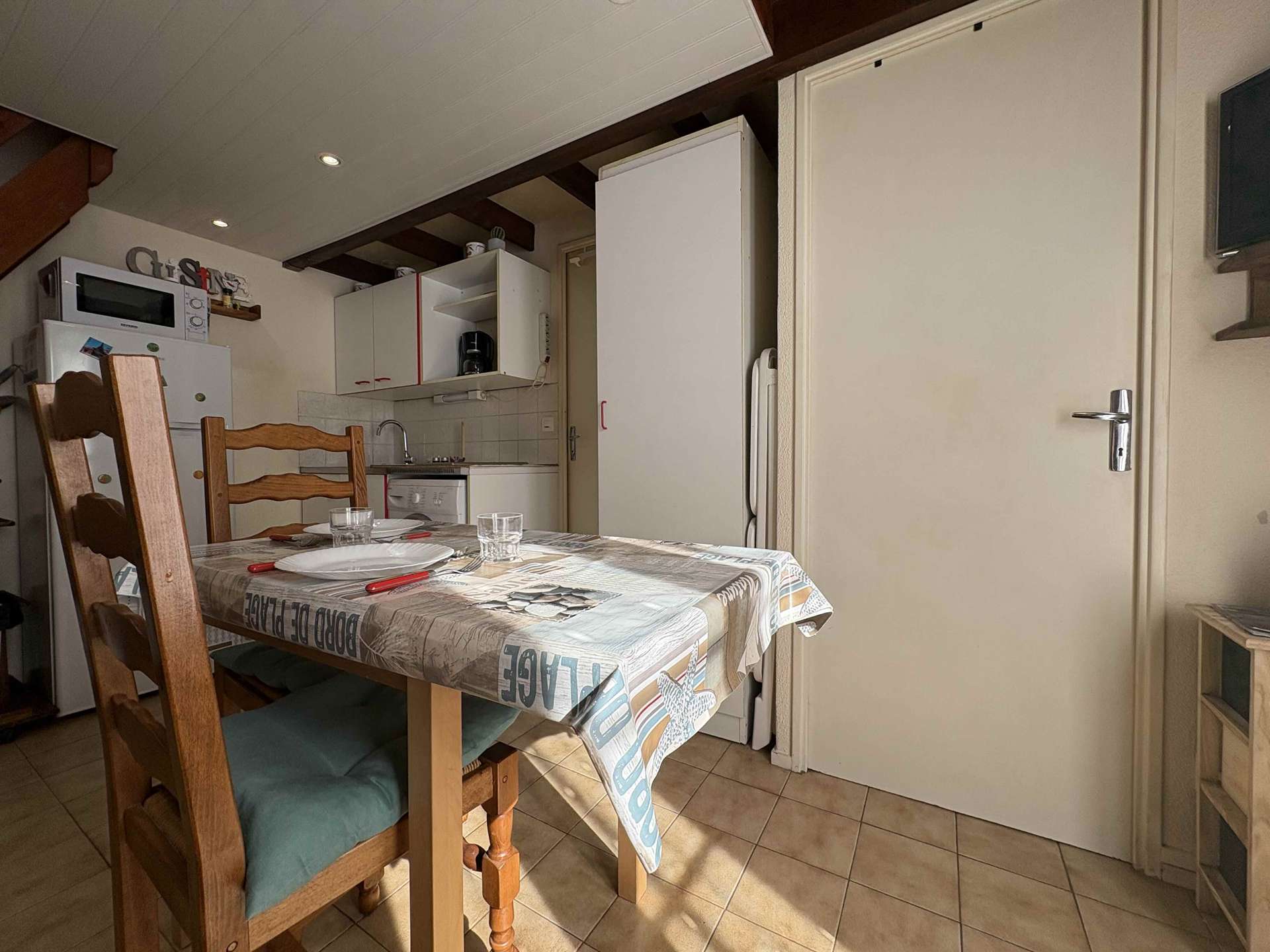 Dolus d'Oléron (17) - La Rémigeasse 2-room mezzanine apartment - approximately 25 m² - up to 4 people In a residence near the seaside, cozy apartment on the 1st floor consisting of a living room opening onto a balcony with terrace, fitted kitchen area (washing machine, fridge/freezer, microwave, ceramic hob), a bedroom with a 140 cm bed, a shower room with separate WC, a mezzanine with two 90 cm beds. the sea: 600 meters from a very beautiful fine sandy beach with nautical activities, free parking for residents, close to cycle paths. Cleaning with disinfection included