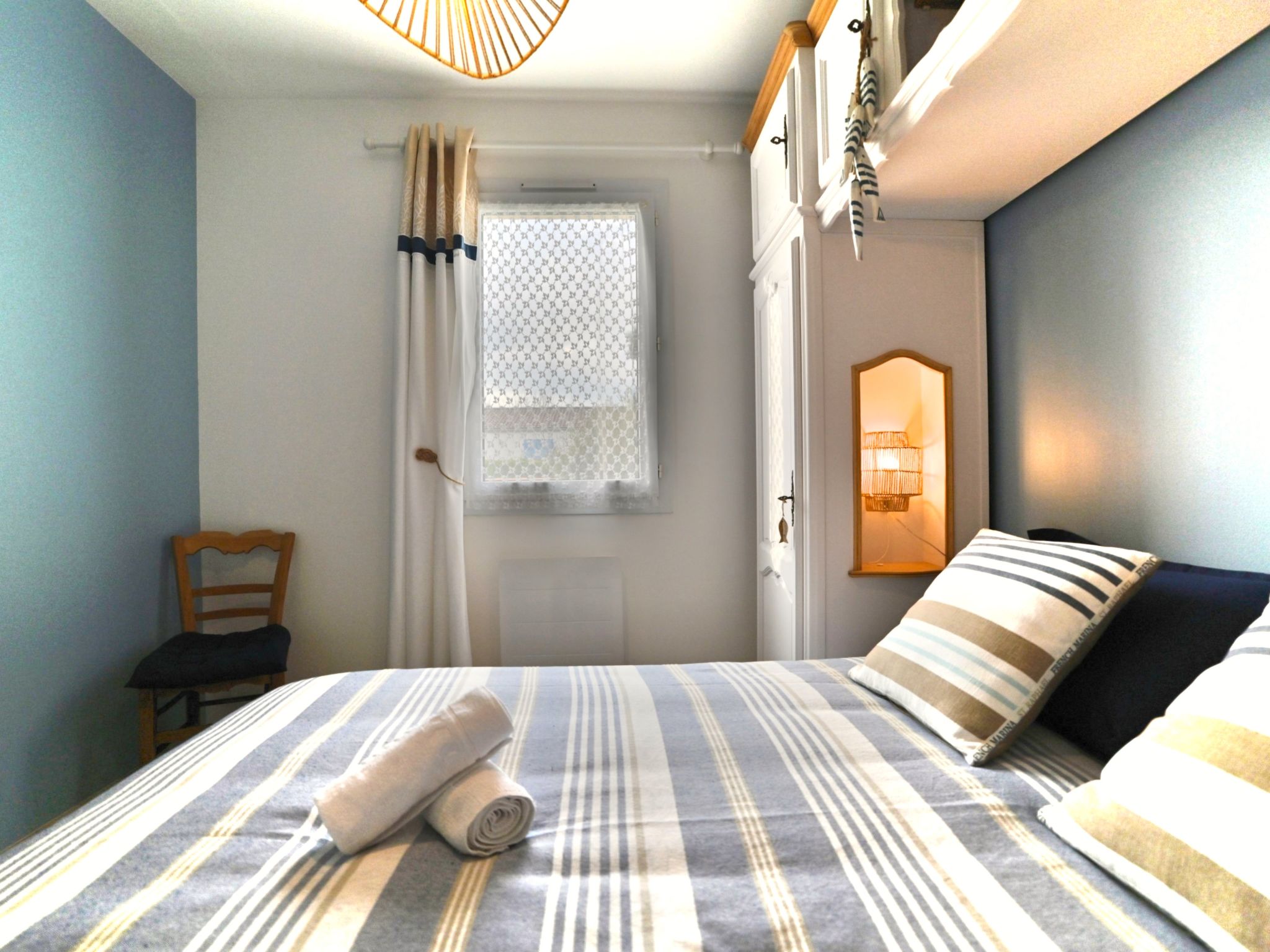 3-room house 60 m2. Beautiful furnishings: living/dining room with 1 double sofabed (140 cm, length 190 cm), TV (flat screen). Exit to the terrace. 1 room with 1 french bed (1 x 160 cm, length 200 cm). 1 room with 1 french bed (1 x 140 cm, length 190 cm). Open kitchen in the entrance (oven, dishwasher, 3 induction hot plates, toaster, kettle, microwave, electric coffee machine). Bathroom, sep. WC. Electric heating. Large terrace 20 m2, garden 200 m2. Terrace furniture, electric barbecue, deck chairs. Facilities: washing machine, hair dryer. Internet (WiFi, free). Parking. Please note: suitable for families. Smoke alarm. Offer by a private individual according to Art. 155, IV of CGI. 17486000209BD