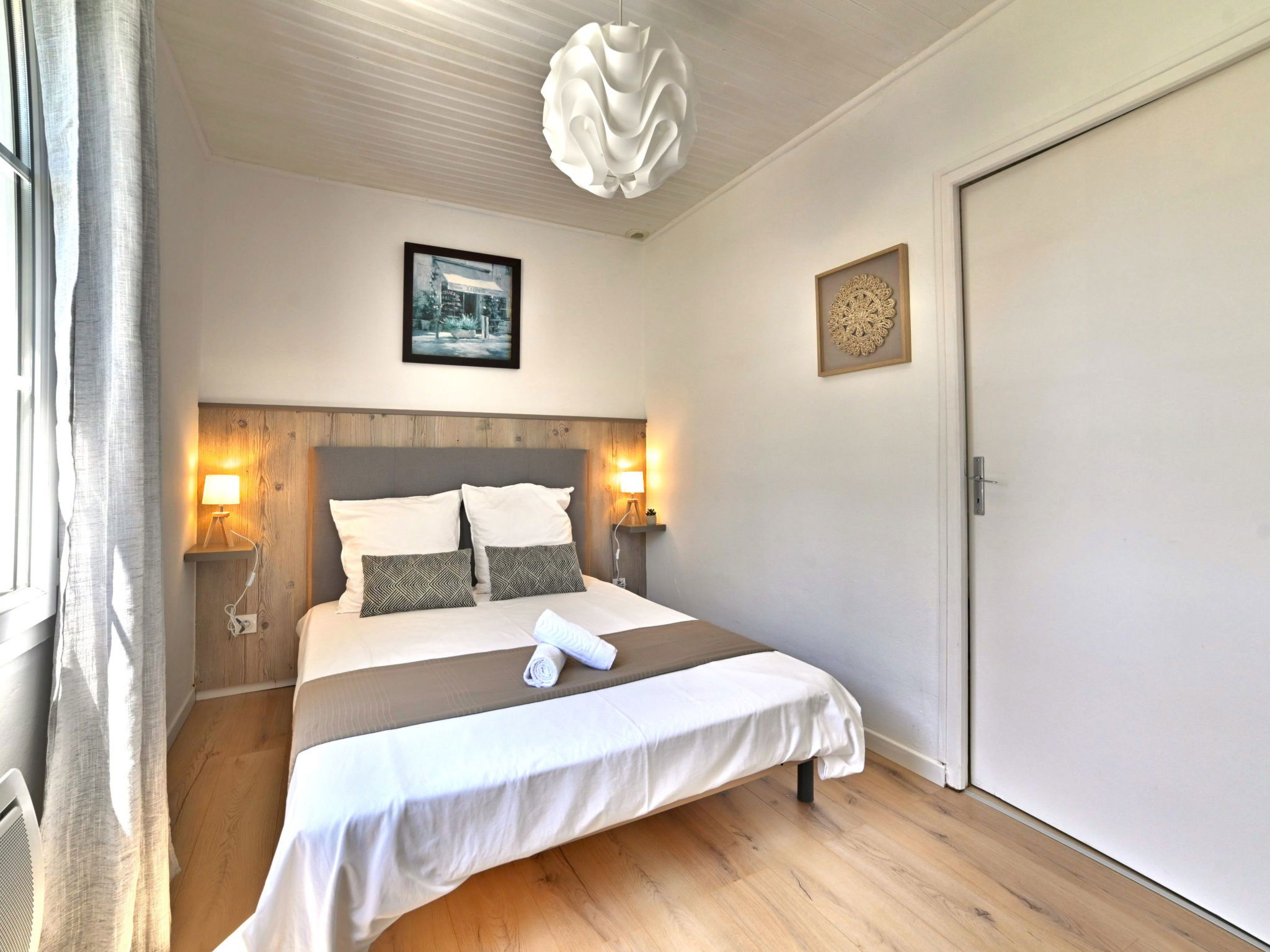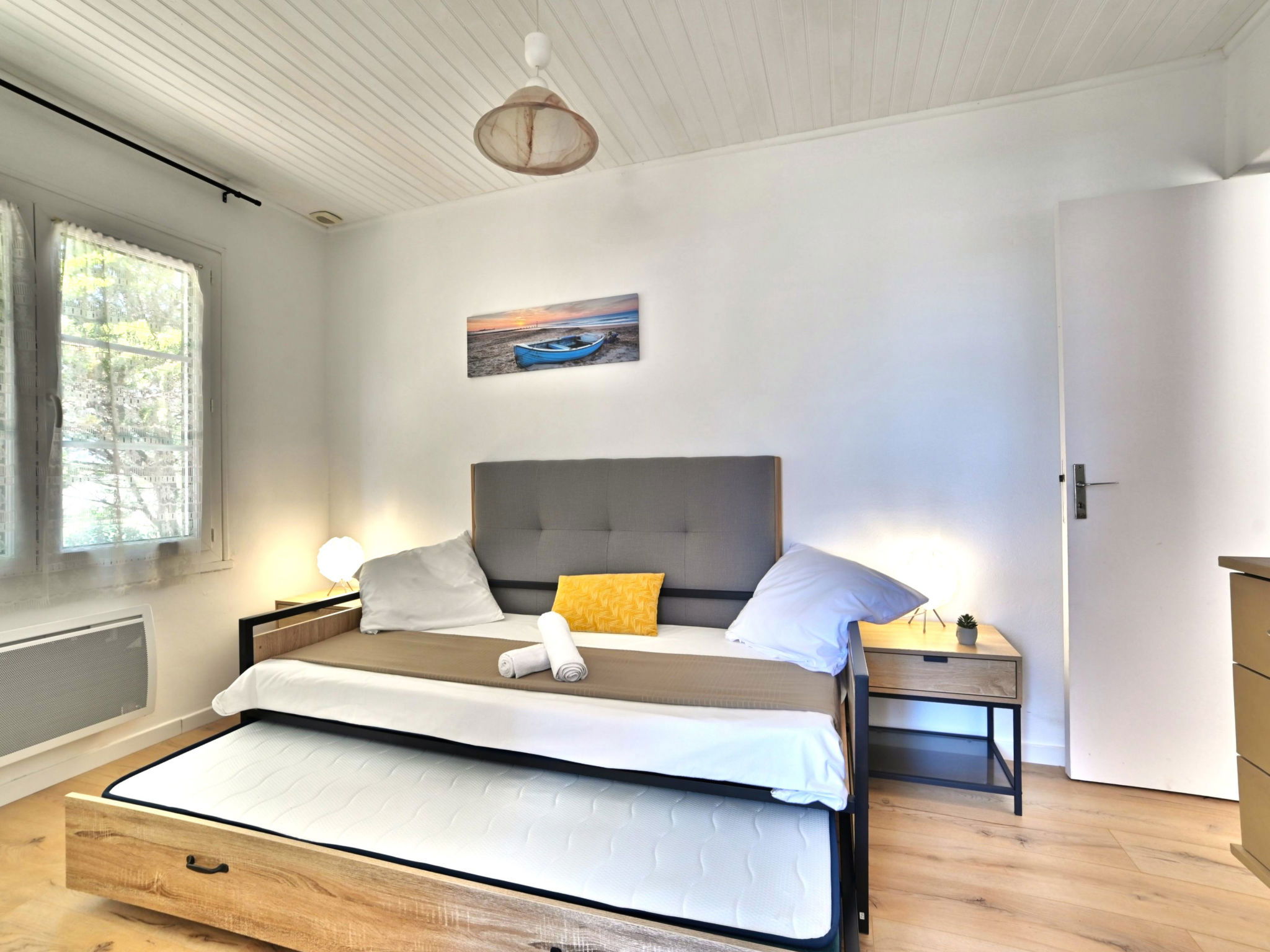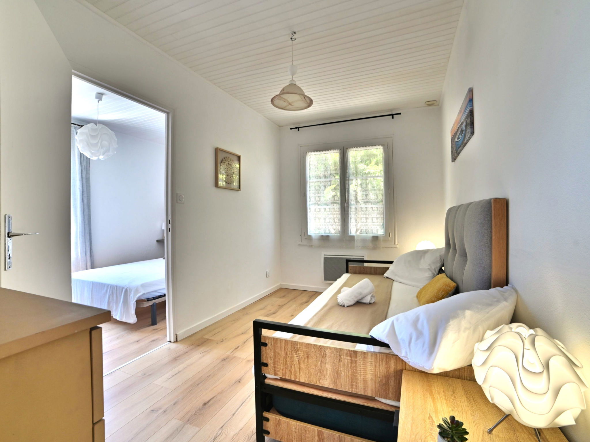 3-room house 43 m2. Comfortable and beautiful furnishings: living/dining room with TV (flat screen). Exit to the garden. 1 room with 1 french bed (140 cm, length 190 cm). 1 room with 1 pull-out bed (2 x 90 cm, length 190 cm). Open kitchen (oven, 3 induction hot plates, toaster, kettle, microwave, electric coffee machine). Bathroom, sep. WC. Electric heating. Terrace. Terrace furniture, barbecue. View of the garden. Facilities: washing machine, hair dryer. Internet (WiFi, free). Parking (1 car) at the house. Please note: non-smoking house. Smoke alarm. Offer by a private individual according to Art. 155, IV of CGI. FR09F51G