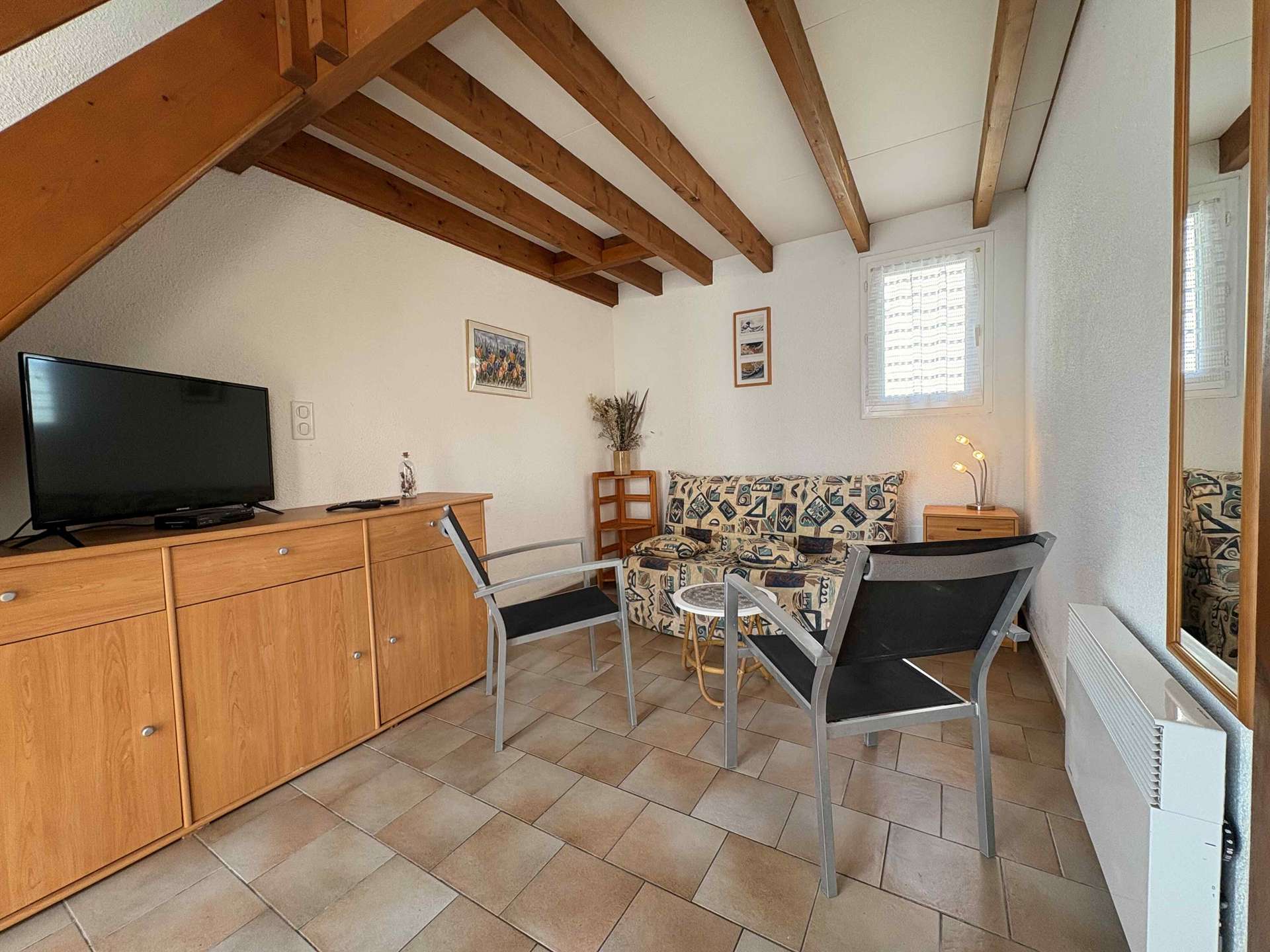 Jolie maison de vacances dans une résidence familiale à deux pas de la plage et de la place du marché de Domino se composant d’une pièce de vie avec canapé et TV ouverte sur une cuisine équipée et aménagée, d'une salle d'eau, WC indépendant.