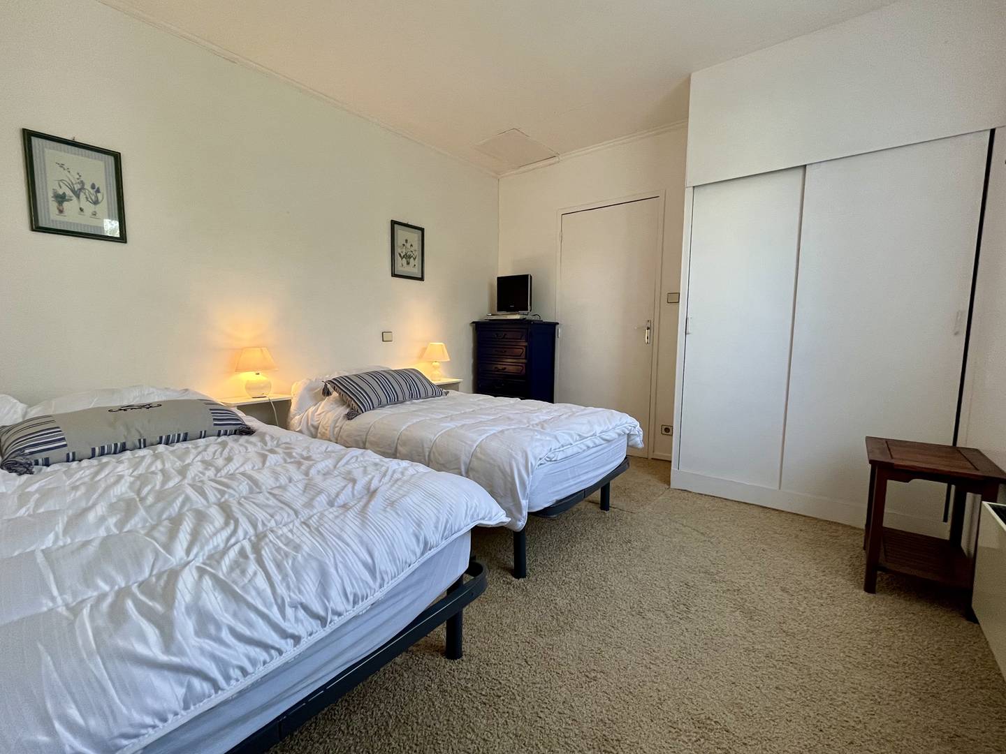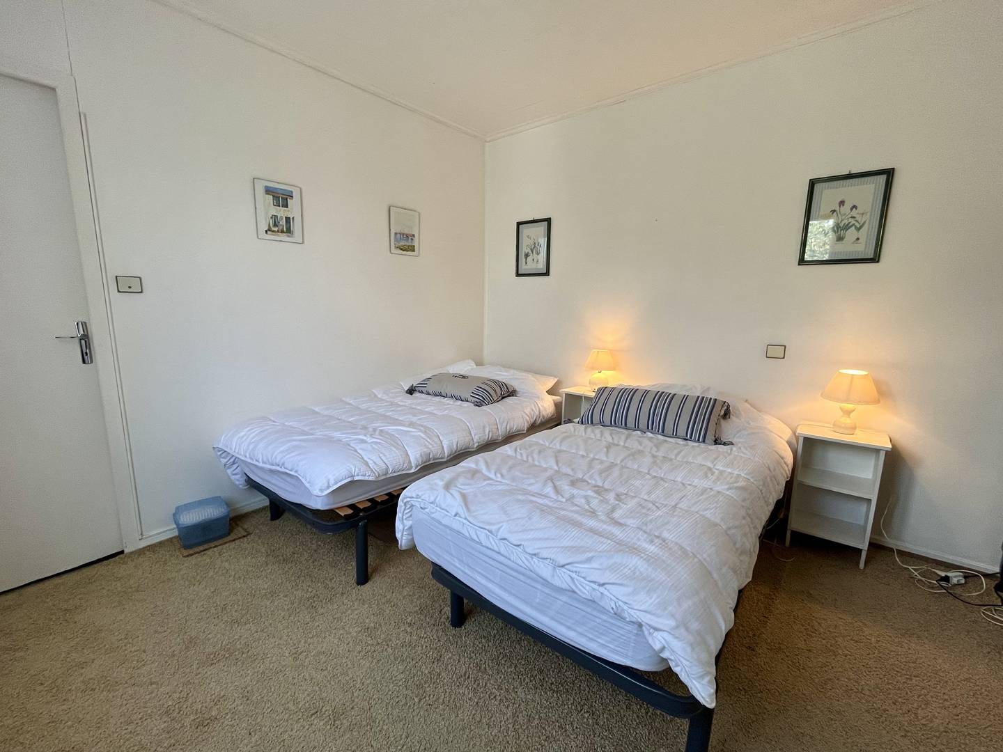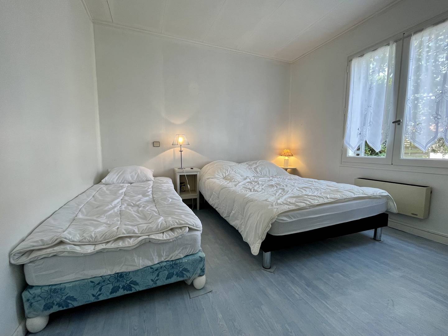 Elle se compose d'une entrée avec coin cuisine équipé (frigo-congélateur, plaques électriques), d'un séjour ouvert sur la terrasse, d'une première chambre avec un lit deux couchages (140) et un lit un couchage (90) avec rangements ainsi qu'une salle d'eau attenante, d'une seconde chambre avec deux lits un couchage (90x2 ou 180) avec rangements et salle d'eau attenante, une buanderie avec lave-linge et un WC séparés. En extérieur, deux terrasses d'environ 30 m² avec salon de jardin et barbecue, garage à usage de rangement avec à disposition 4 vélos.